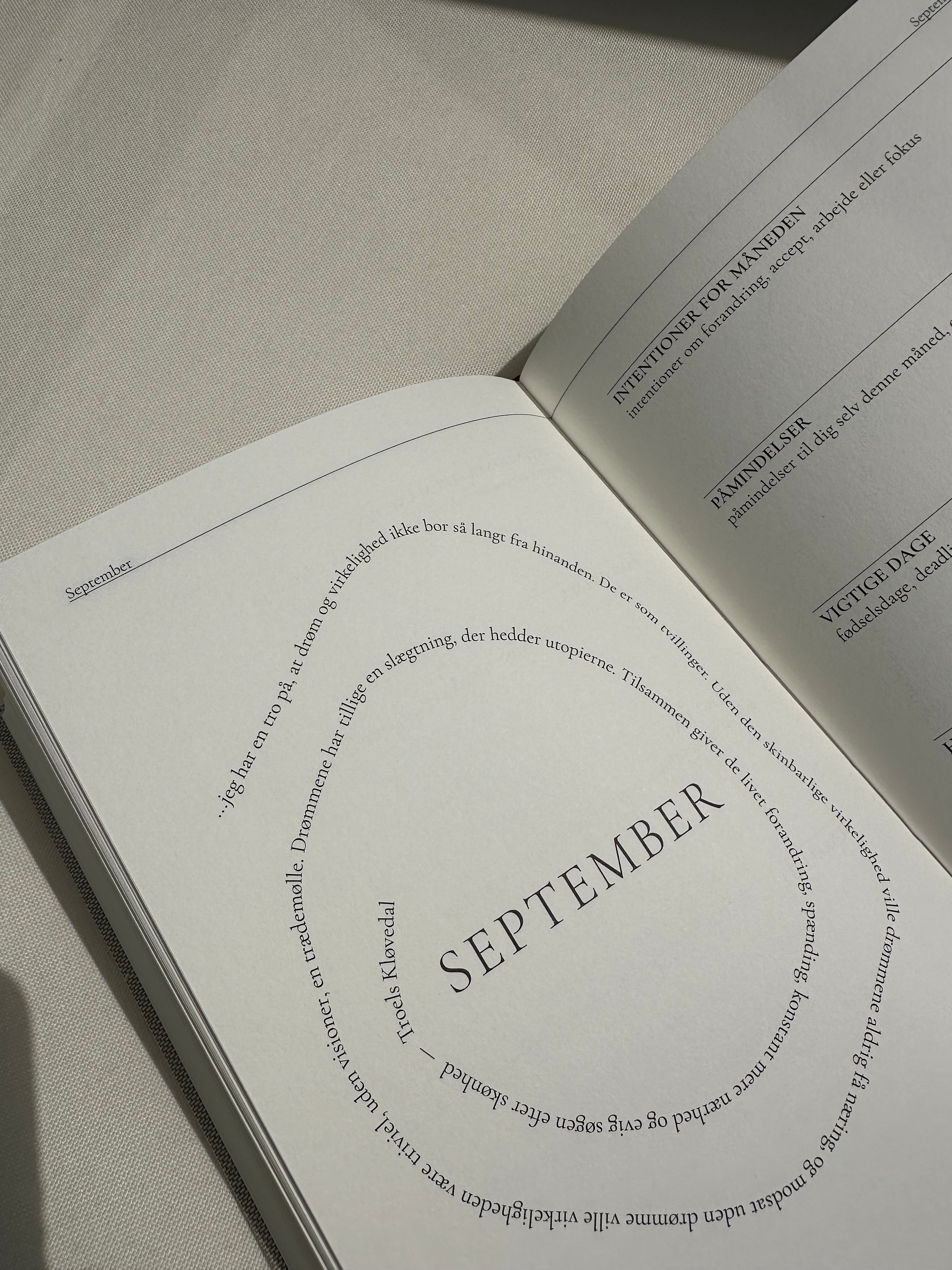 Bogen er delt op i årets måneder og inviterer til at tjekke ind i starten af måneden og se på intentioner, påmindelser og det, der er vigtigt for dig i din proces. Det giver også mulighed for senere at se tilbage på din proces, oplevelser, refleksioner, valg og beslutninger samt begivenheder inden for de forskellige måneder.